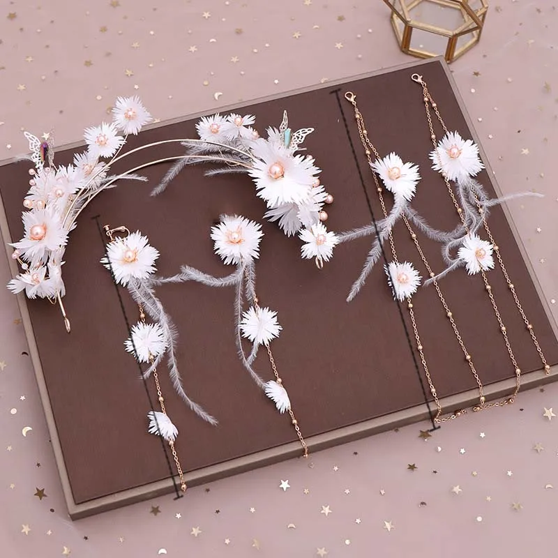 FORSEVEN Bridal Bride Fairy Wedding White Flower Pearl Handmade Hairband with Long Feather Tassels