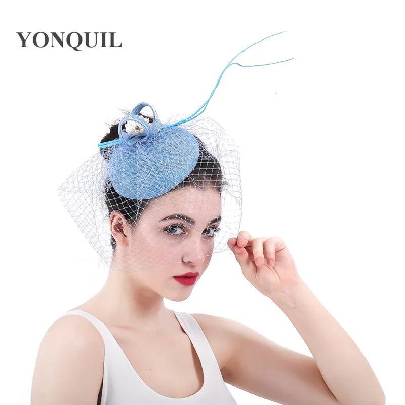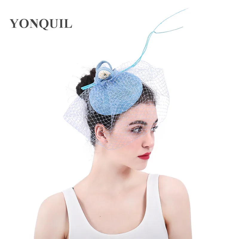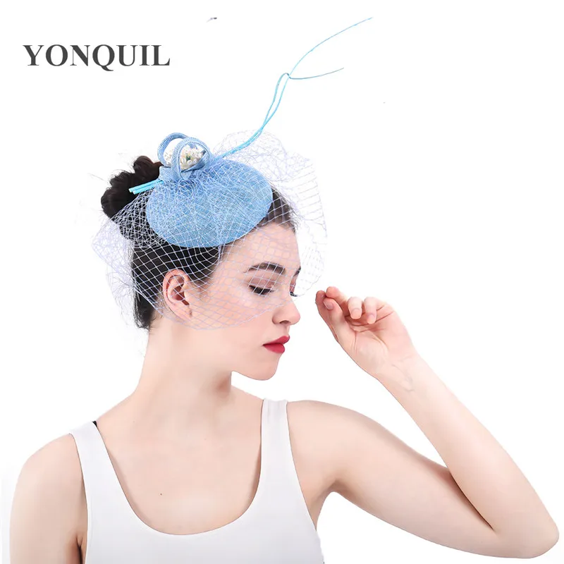 HOT Sale Ladies light blue Fascinator Mesh Hair Clip summer pillbox Fedoras Hat For Formal Party elegant wom